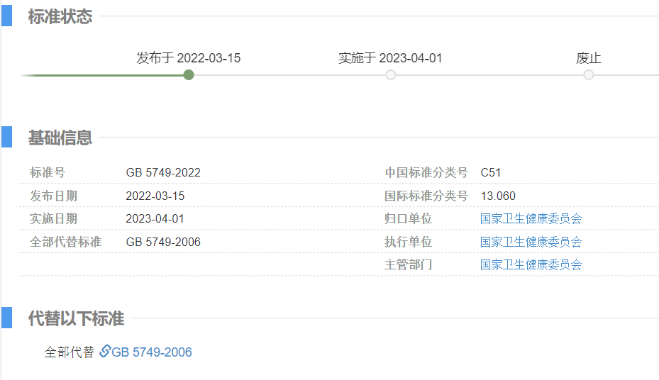 其中《生活飲用水衛(wèi)生標(biāo)準(zhǔn)》(GB 5749-2022)由國(guó)家衛(wèi)生健康委員會(huì)歸口上報(bào)及執(zhí)行,主管部門為國(guó)家衛(wèi)生健康委員會(huì),將全部代替現(xiàn)行的 GB5749-2006,于 2023年4月1日 開始實(shí)施。目前,全國(guó)標(biāo)準(zhǔn)信息公共服務(wù)平臺(tái)暫未正式發(fā)布標(biāo)準(zhǔn)全文,預(yù)計(jì)于4月上旬公布(發(fā)布后20個(gè)工作日內(nèi))。